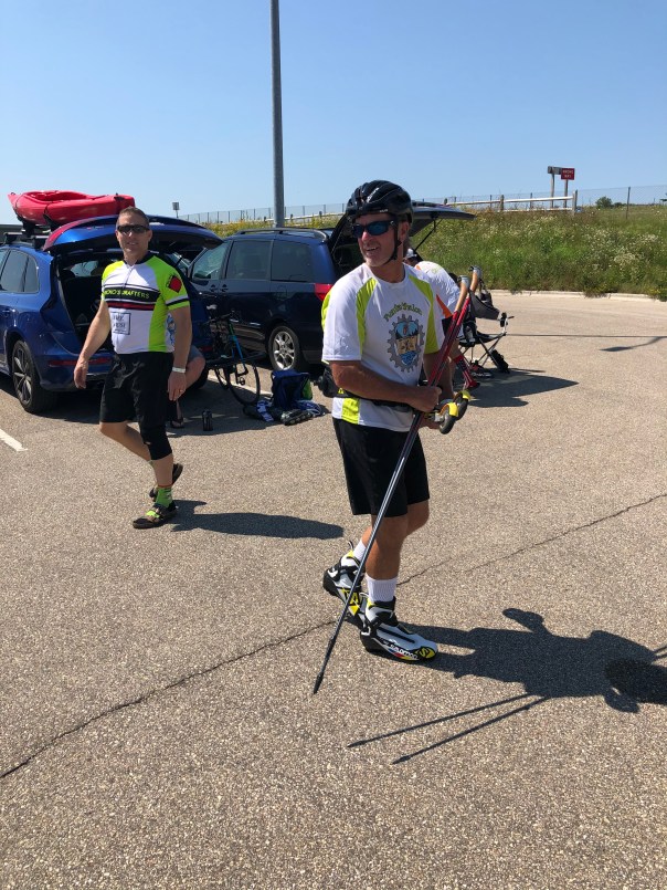 Those Funtathletes who opted for roller skis had a slower road. Loose Screw got off to a slow start to begin with (see key fiasco above). FishNBoots, with only 12 hours of notice, didn’t have time to repair his roller skis, which had lost their ability to track in a straight line.